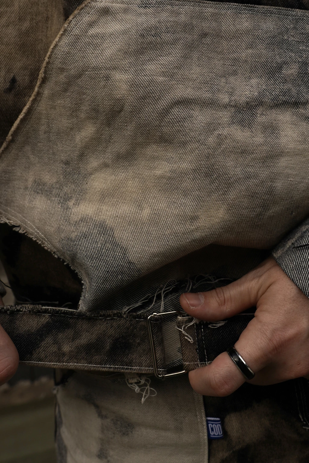 Buzo corte boxy oversize, con cuello alto medio cierre, bolsillo central tipo canguro y bolsillos cargo en mangas. Confeccionado en denim rigido 100% algodon, con efecto desgastado realizado de manera artesanal (puede haber pequeñas variaciones en el patron de desgastado y su color.) Costuras a la vista reforzadas con hilo al tono, avios y cierres de acero inoxidable, bolsillos funcionales, la cintura incluye cinturon para ajustar a gusto.